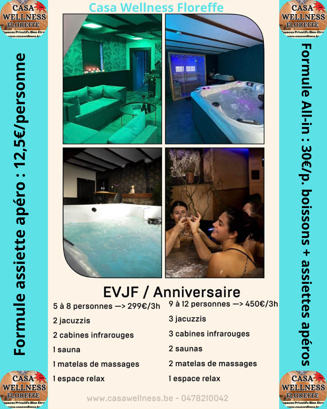 Vous aurez le choix entre passer un moment durant 2h30 ou une nuitée dans un espace romantique - d'exception - insolite qui est composé d'un jacuzzi, d'un sauna, d'une cabine infrarouge, d'un matelas d'andullations, ...